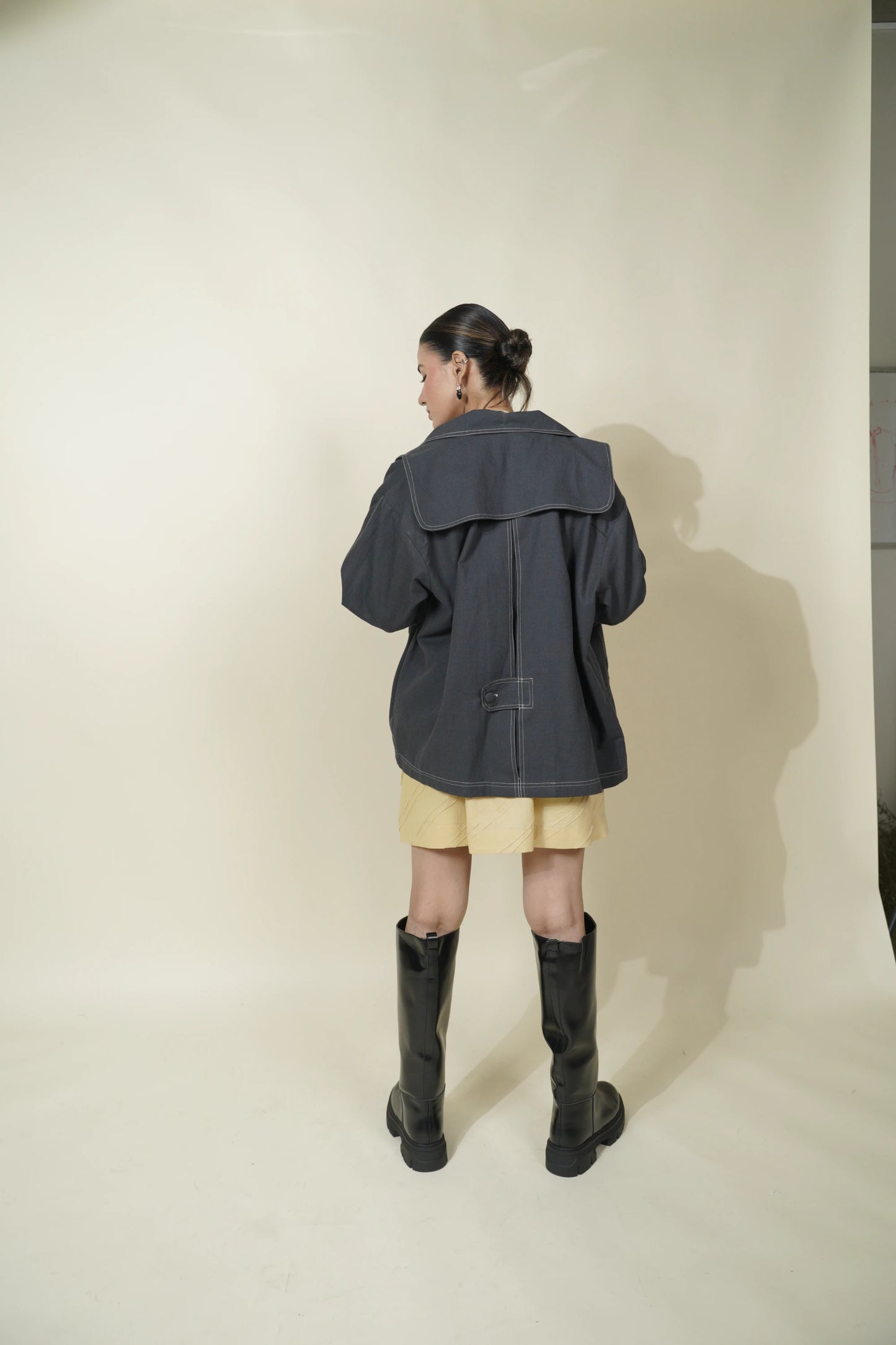 The bomber jacket is crafted from eco-friendly grey cotton fabric.