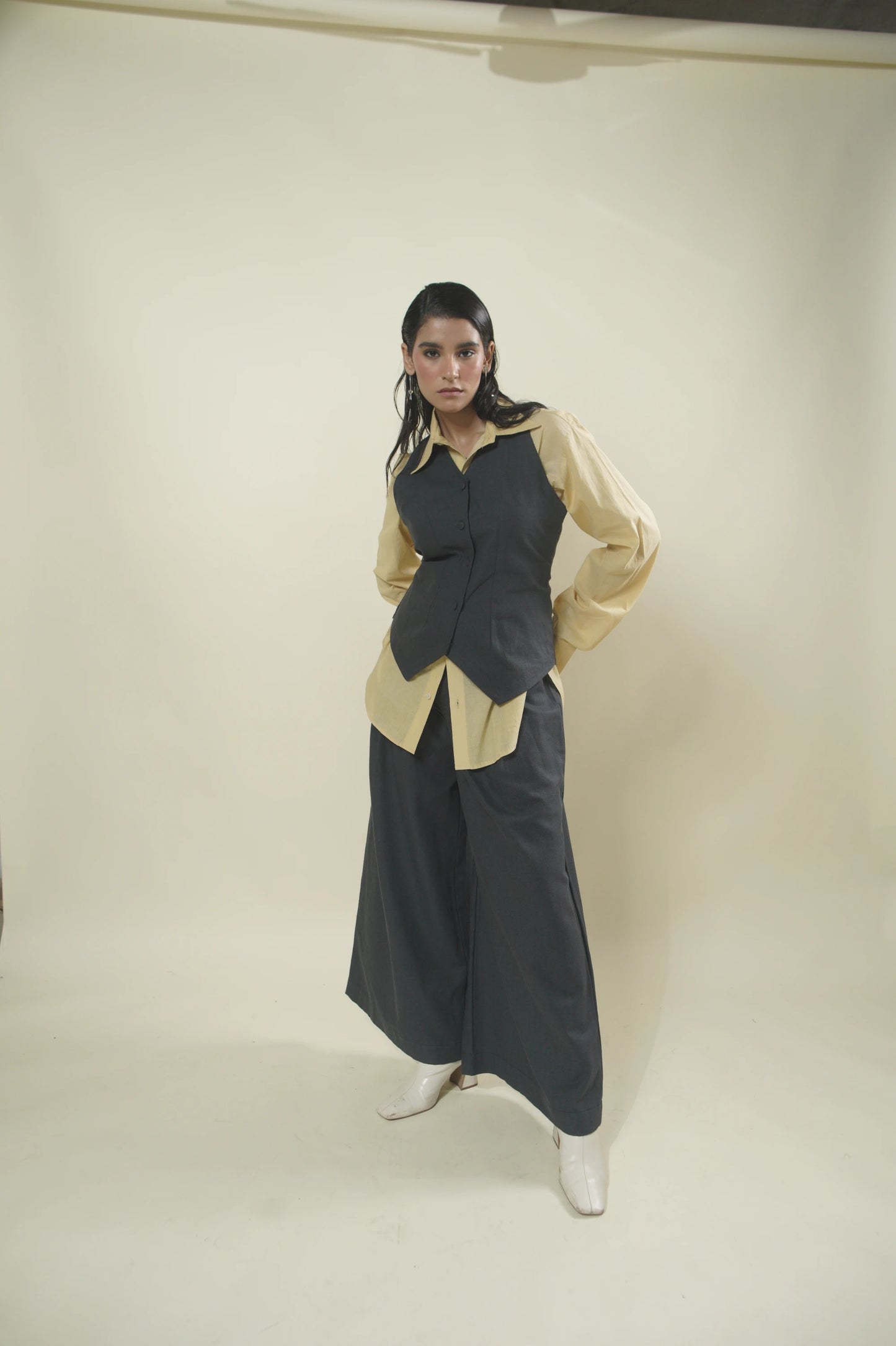 The sleeveless V-neck vest coat with an open front and adorned with elegant buttons. This fashion-forward piece effortlessly combines sophistication with modern flair, providing a stylish layering option for a range of occasions.